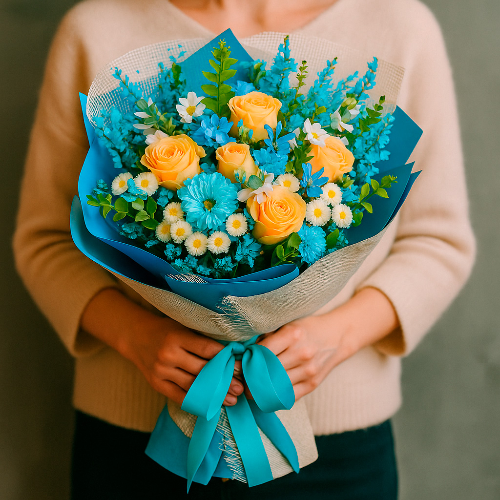 Изысканная композиция из кремовых роз, белых маргариток и голубой лунарии создаёт атмосферу нежности и романтики. Букет оформлен в матовую плёнку и перевязан атласной лентой, что подчёркивает его элегантность. Возможны варианты упаковки с крафт-бумагой или декоративной сеткой. Прекрасный подарок для любимой на годовщину или свадьбу.