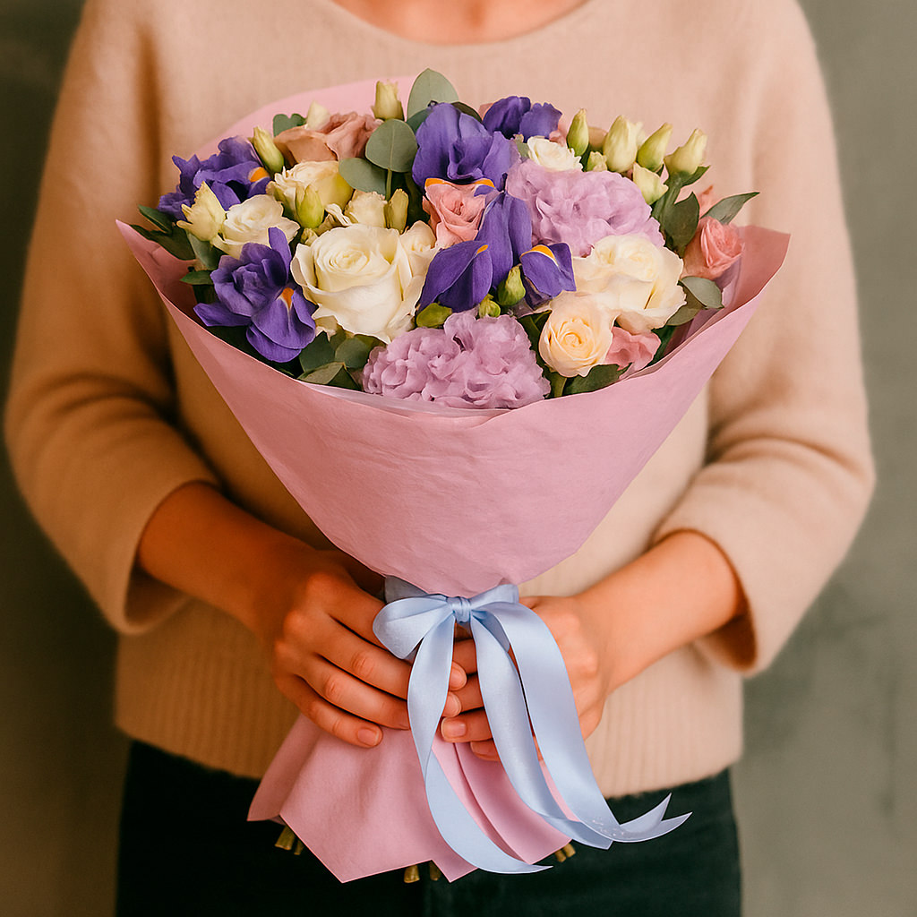 В этом букете гармонично сочетаются белые розы, сиреневые кустовые розы и эустомы, фиолетовые ирисы и свежий эвкалипт. Упакован в нежную розовую матовую плёнку и перевязан атласной лентой. Возможны альтернативы оформления: крафт-бумага или декоративная сетка. Прекрасный выбор для подарка на день рождения для любимой.