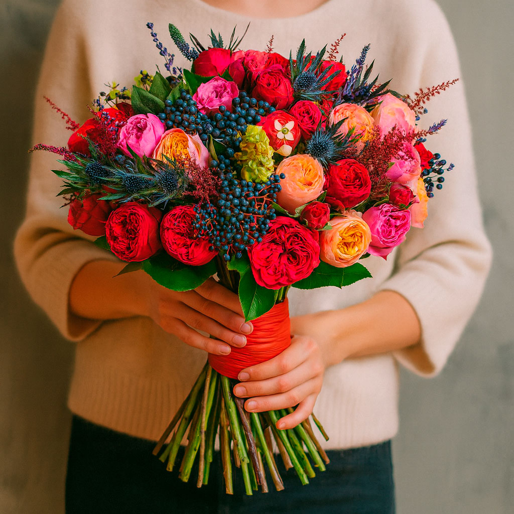 Яркое сочетание эрингиума, пионовидных роз красного, розового и персикового оттенков, лаванды, астильбы, вероники, орнитогалума и вибурнума создаёт уникальную композицию. Букет перевязан яркой лентой, подчёркивающей его элегантность. Возможны альтернативы с матовой плёнкой или крафт-бумагой. Прекрасный выбор для подарка на день рождения или для любимой.