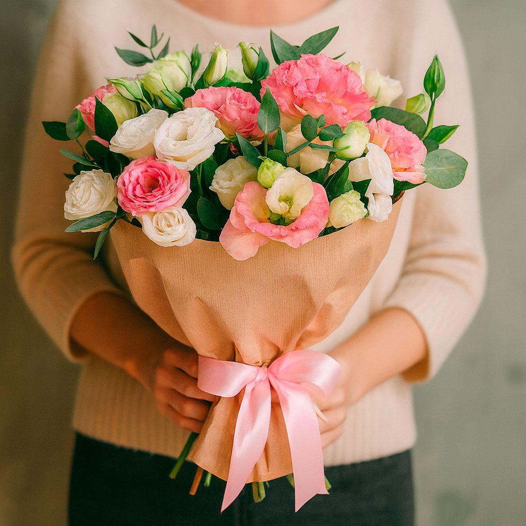 Эустома микс в белых и розовых оттенках, дополненная свежим эвкалиптом, создаёт нежный и воздушный образ. Букет оформлен в крафт-бумагу и перевязан розовой атласной лентой. Возможны варианты упаковки с матовой плёнкой или декоративной сеткой. Прекрасный выбор для любимой на день рождения.