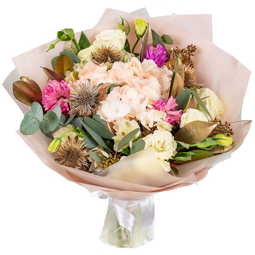 Нежно-розовая гортензия, белая эустома, розовый и сиреневый гиацинт, эрингиум и эвкалипт создают гармоничную композицию. Букет оформлен в матовую плёнку и перевязан атласной лентой, что подчеркивает его изысканность. Возможны альтернативы упаковки: крафт-бумага или декоративная сетка. Прекрасный выбор для подарка на день рождения для любимой.