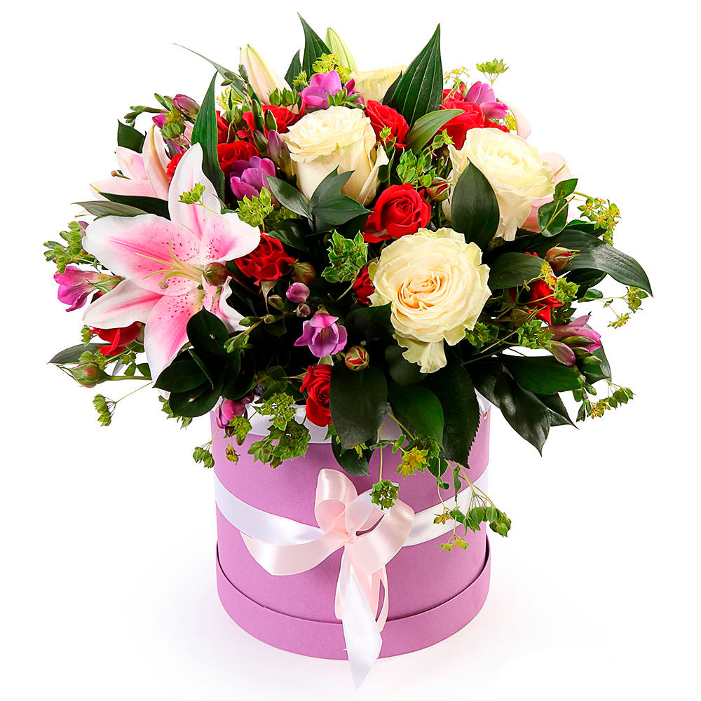 Кремовые одноголовые розы, красные кустовые розы и розовые лилии создают яркий и элегантный ансамбль, дополненный зеленью микс. Композиция оформлена в стильной розовой шляпной коробке, перевязанной атласной лентой. Альтернативные варианты упаковки: бархатная коробка или коробка с принтом. Прекрасный подарок для любимой на день рождения или годовщину.