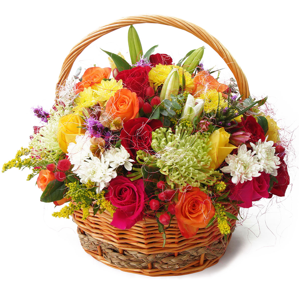 Яркие розы желтых, красных и оранжевых оттенков гармонично сочетаются с белыми и желтыми кустовыми хризантемами, зелеными одноголовыми хризантемами и белыми лилиями. Гиперикум и солидаго добавляют композиции изысканности, а эвкалипт придаёт свежесть. Корзина из ротанга подчёркивает естественность и красоту цветов. Возможны альтернативы оформления: корзина из лозы или плетёная корзина. Прекрасный выбор для поздравления на день рождения или для любимой женщины.