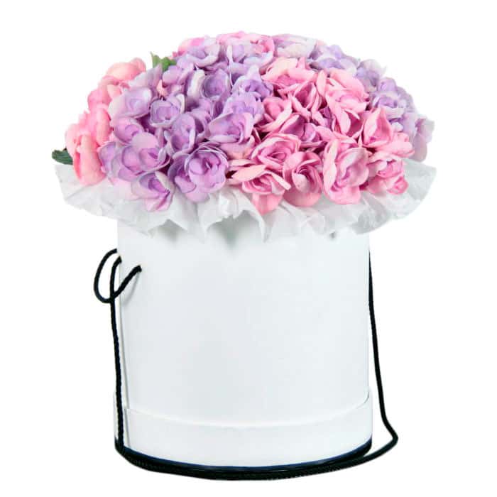 Роскошная композиция из розовой и сиреневой гортензии в белой шляпной коробке. Нежные оттенки создают атмосферу утончённой элегантности. Возможны альтернативы оформления: бархатная коробка или коробка с принтом. Прекрасный подарок для любимой на годовщину или день рождения.