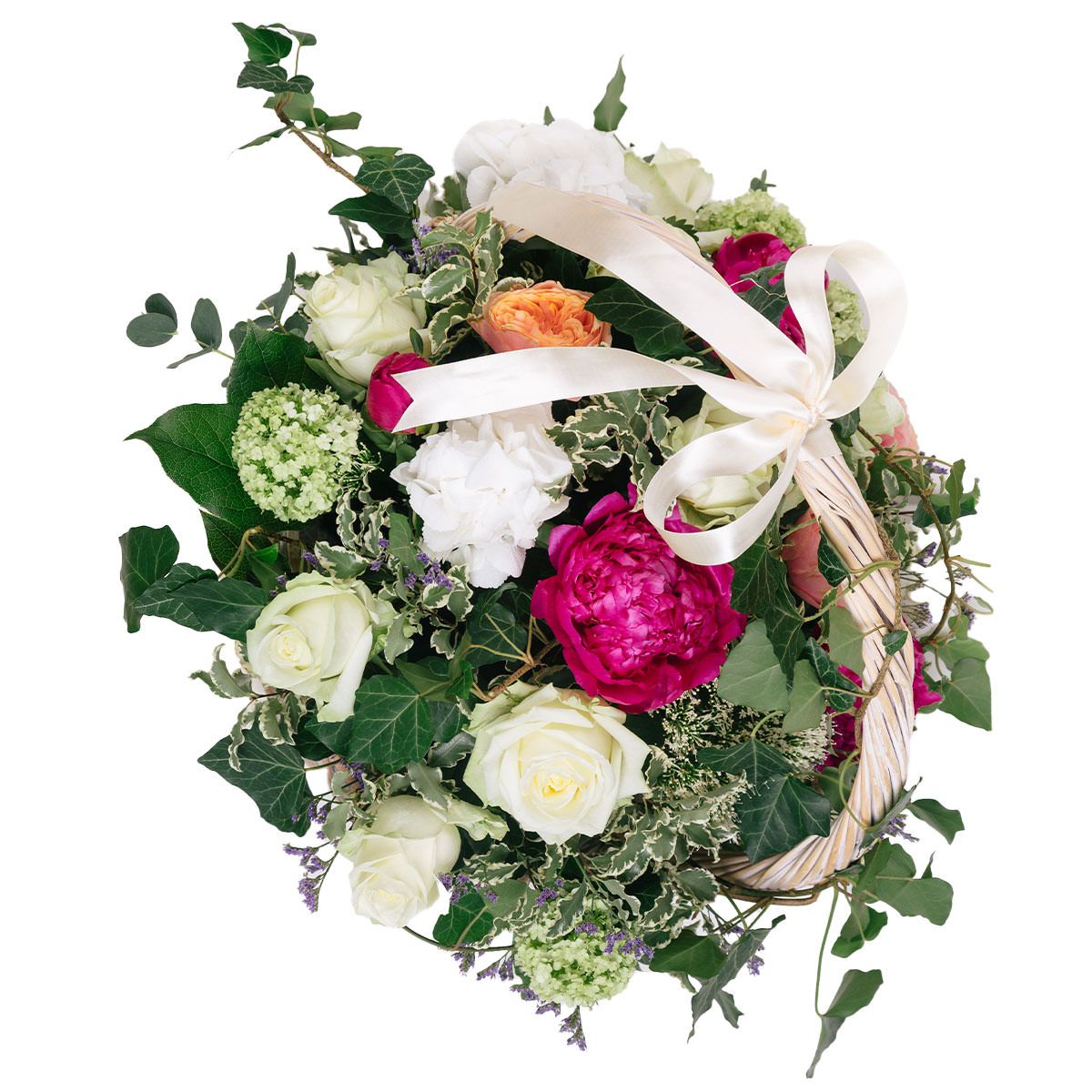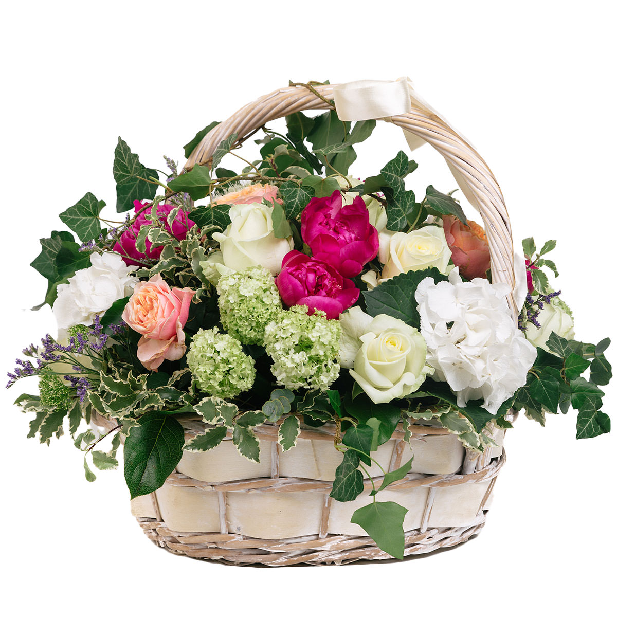 Белые и персиковые розы, розовые пионы и белая гортензия создают элегантную композицию, дополненную зелёной гортензией и плющом. Корзина из светлого дерева украшена атласной лентой. Возможны варианты с корзиной из ротанга или плетёной корзиной. Прекрасный подарок для мамы на юбилей или на свадьбу.