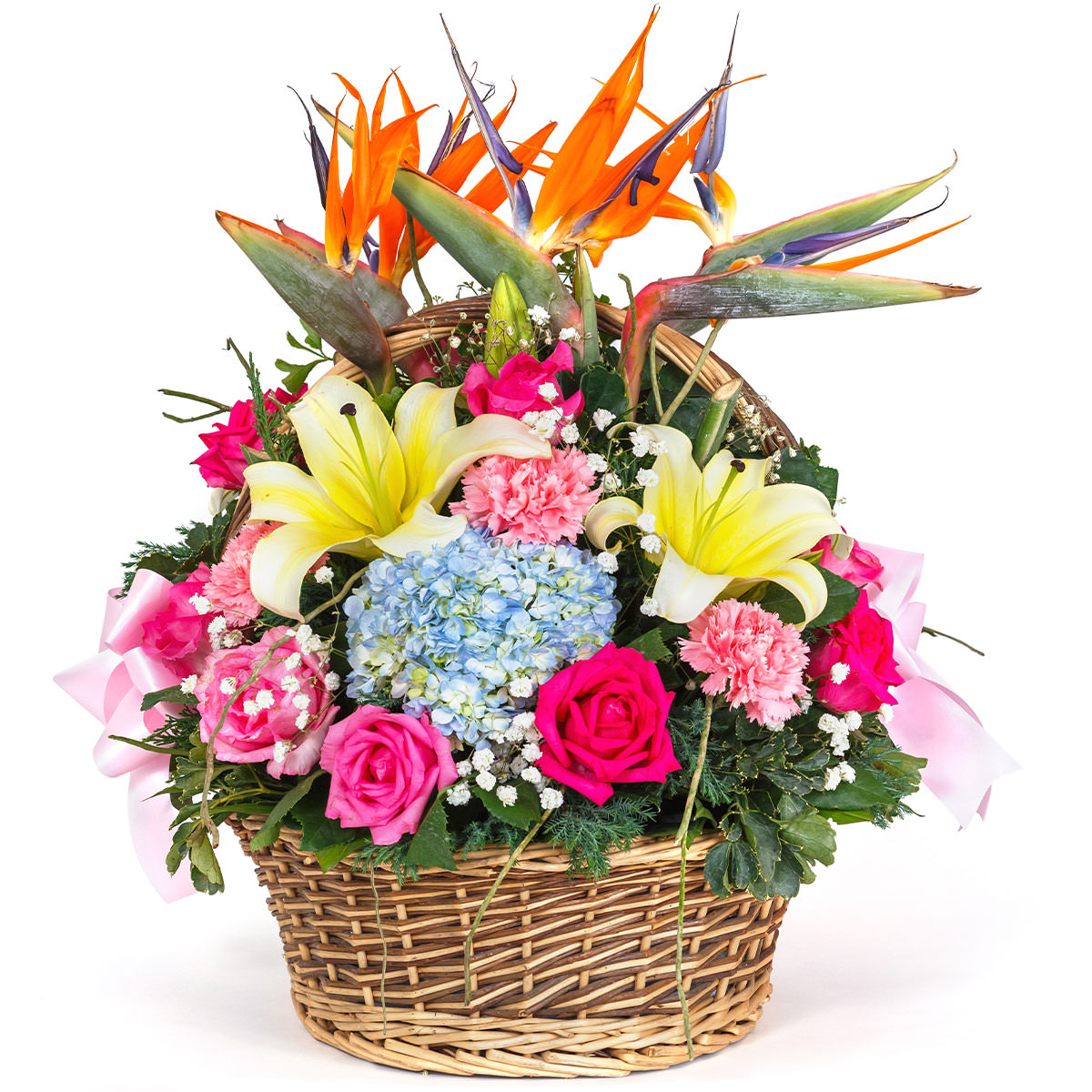 Яркая цветочная композиция сочетает в себе розовые розы, голубую гортензию, белые лилии, экзотическую стрелицию, розовые гвоздики и нежную гипсофилу. Плетёная корзина добавляет естественности и шарма. Альтернативные варианты оформления: корзина из лозы или корзина из ротанга. Прекрасный подарок для любимой на день рождения или годовщину.