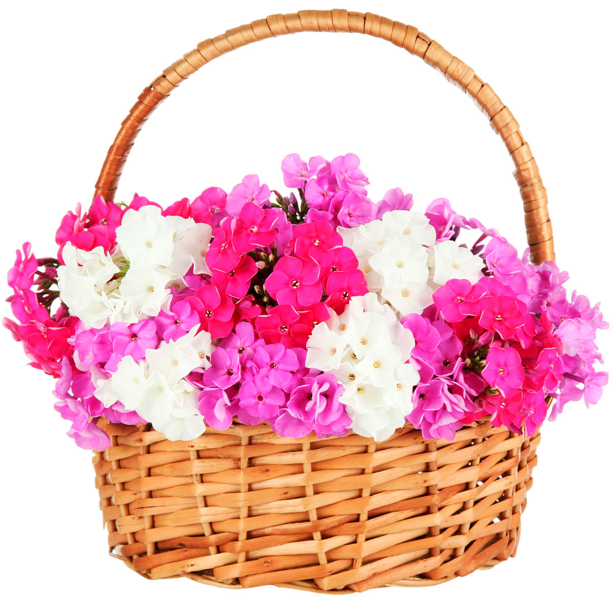 Яркие розовые и белые флоксы создают неповторимый контраст в этой цветочной композиции. Плетёная корзина добавляет естественности и шарма. Возможны альтернативы оформления: корзина из лозы или корзина из ротанга. Прекрасный подарок для мамы на День матери или юбилей.
