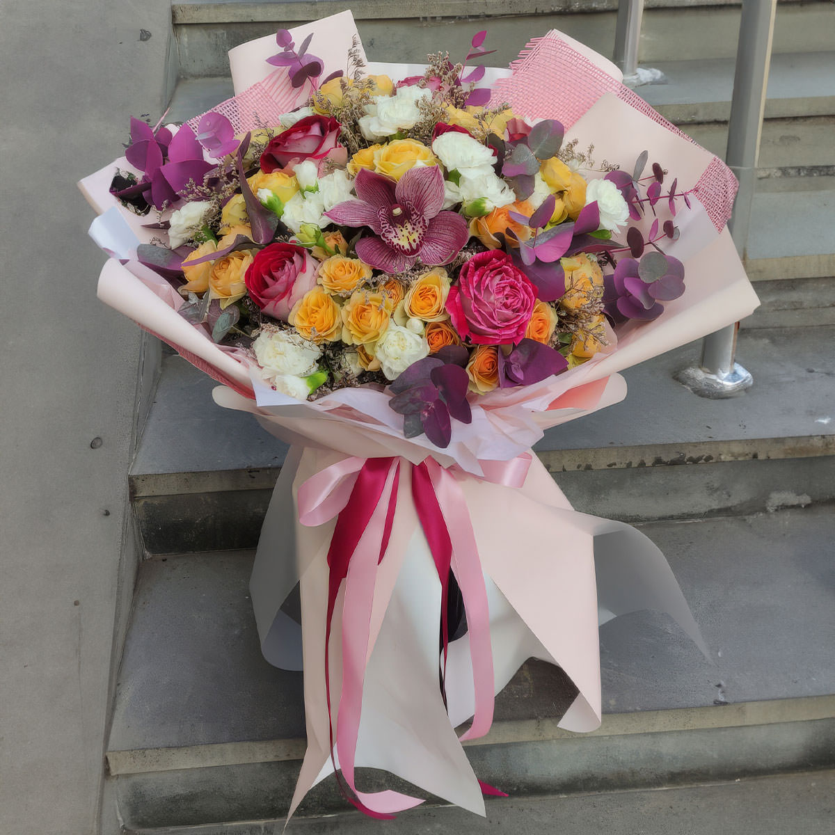 | Состав: | Розы, Эвкалипт, Гвоздики, Кустовые розы, Орхидеи |