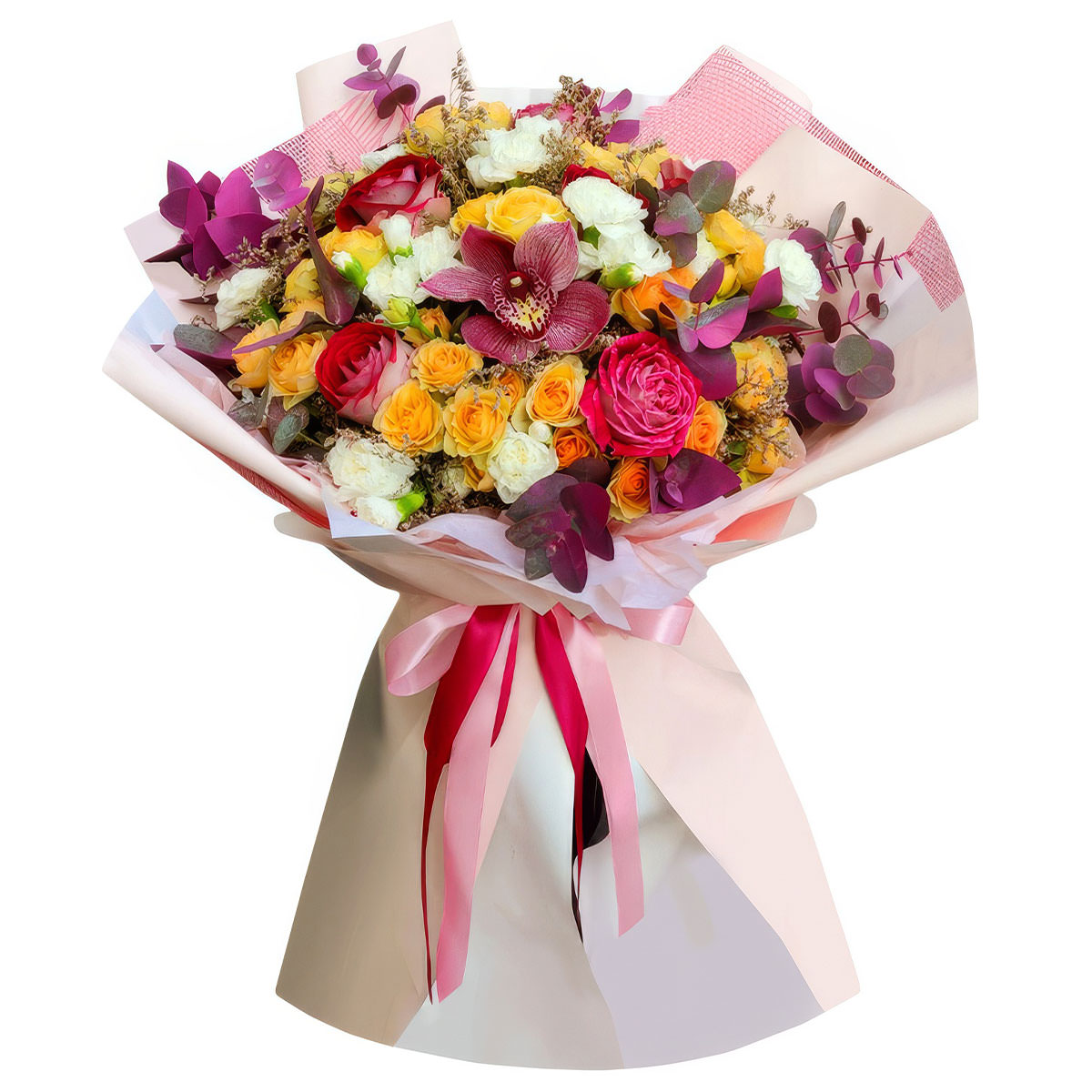 Роскошный букет сочетает в себе розовые орхидеи, жёлтые кустовые розы, розовые одноголовые розы и белые мини-гвоздики, дополненные эвкалиптом. Упакован в матовую плёнку и перевязан атласной лентой. Возможны альтернативы оформления: крафт-бумага или декоративная сетка. Прекрасный выбор для подарка на годовщину или для любимой.
