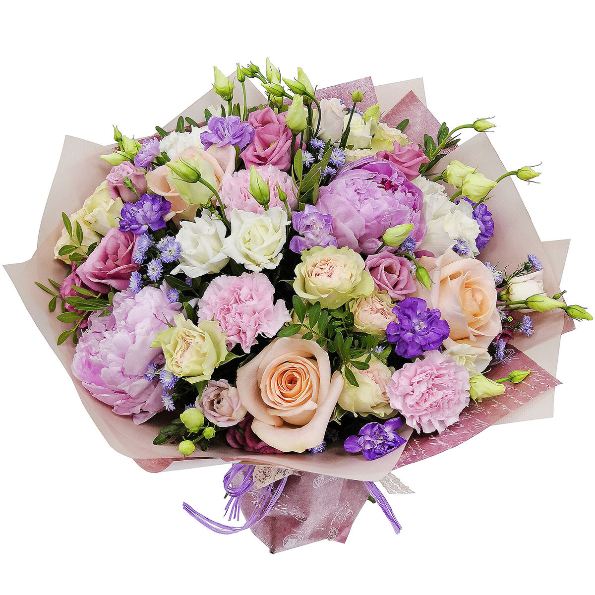 Роскошный букет сочетает в себе розовые пионы, кремовые одноголовые и кустовые розы, белую и розовую эустому, розовую гвоздику, фиолетовую маттиолу и зелень фисташки. Упакован в матовую пленку с нежной лентой. Возможны альтернативы: крафт-бумага или декоративная сетка. Прекрасный выбор для подарка на день рождения для любимой.