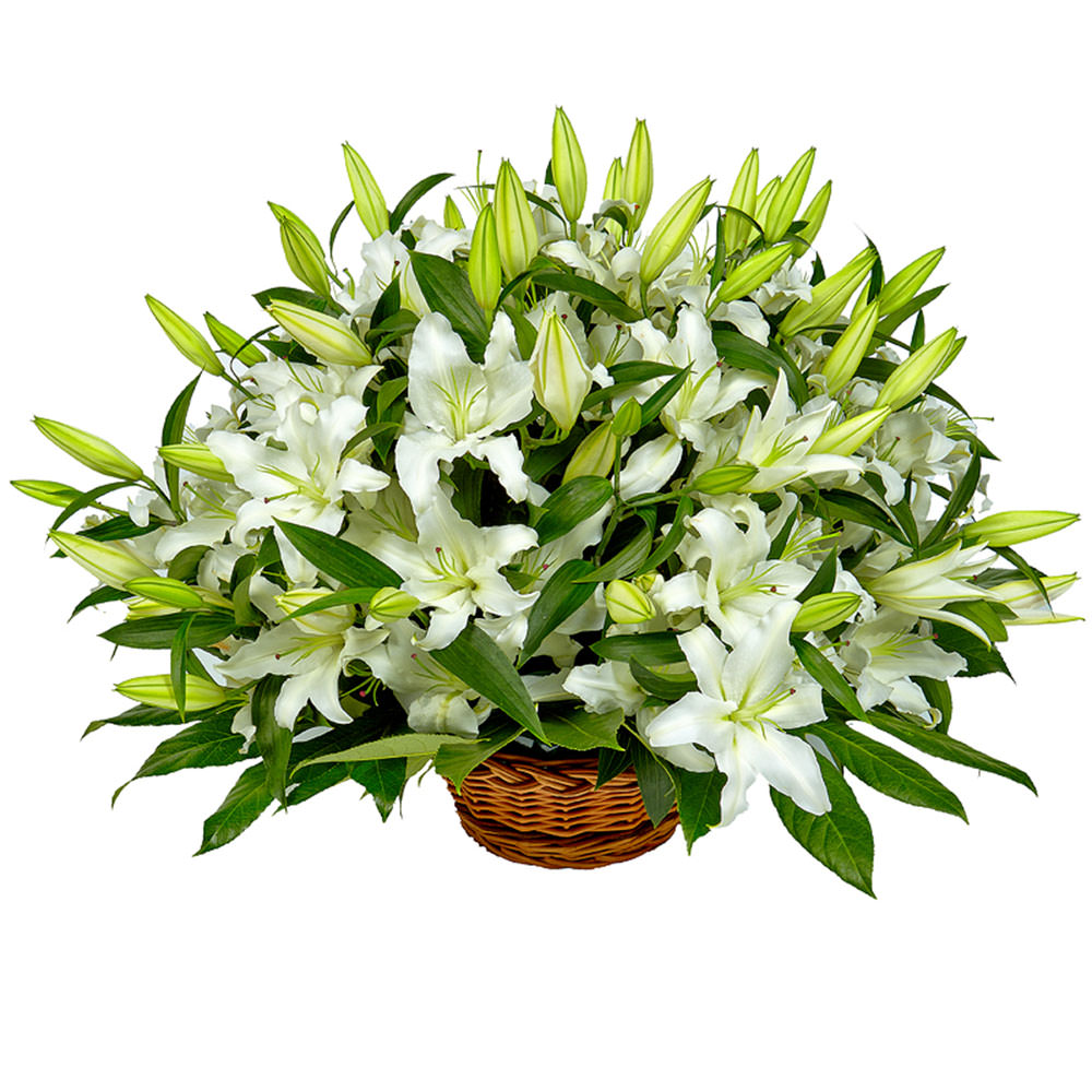 Белоснежные лилии в плетёной корзине создают атмосферу нежности и утончённости. Корзина из лозы подчёркивает естественную красоту цветов. Возможны другие варианты оформления: корзина из ротанга или с тканевой отделкой. Прекрасный подарок для мамы на День матери или для любимой на годовщину.